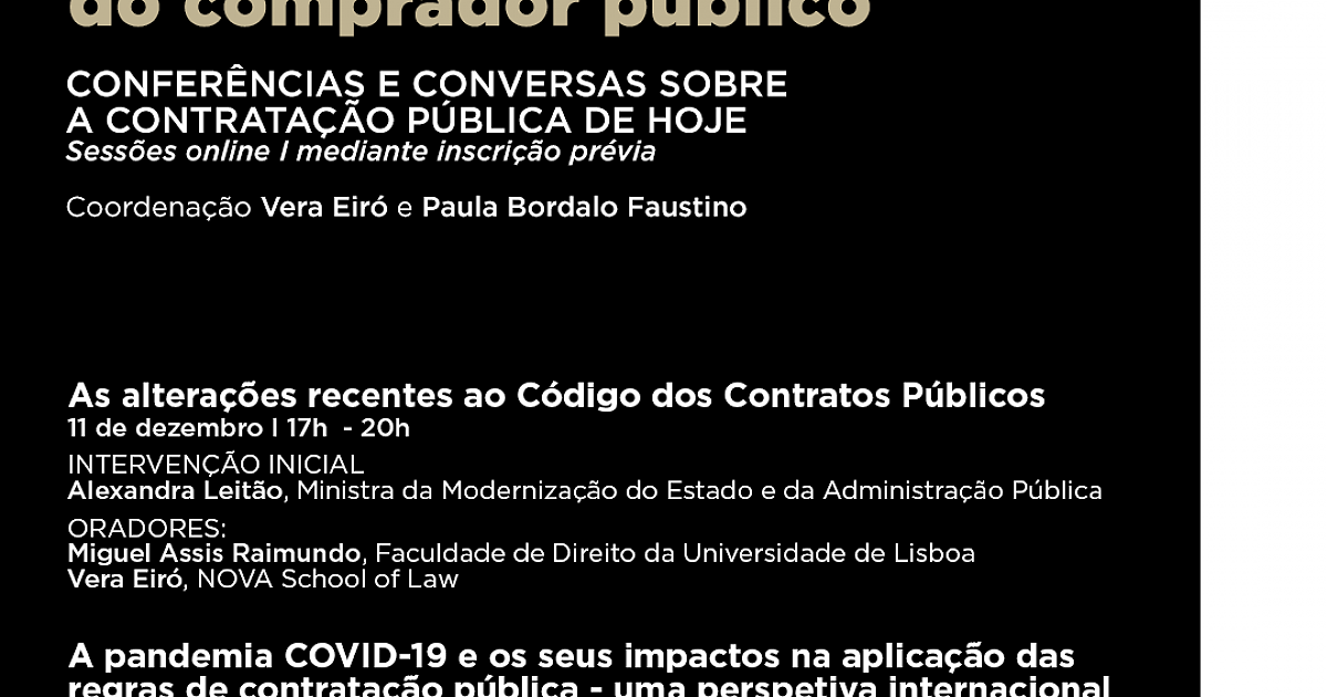 A decorrer desde o mês de maio, o Curso de Especialização sobre Profissionalização do Comprador Público, promovido pela Faculdade de Direito da Universidade Nova de Lisboa e a Jurisnova, tem aprofundado vários temas relacionados com a Contratação Pública. As sessões online «Conferências e Conversas sobre Contratação Pública de Hoje» inserem-se nesta 1ª edição do Curso de Especialização sobre Profissionalização do Comprador Público e têm como objetivo a partilha de conhecimento entre profissionais internacionais sobre temáticas recentes relacionadas com Contratação Pública.