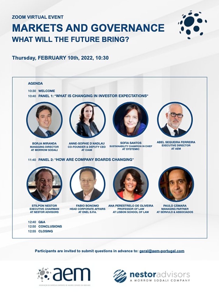 Paulo Câmara, Managing Partner da SÉRVULO e sócio do departamento de Financeiro e Governance, é orador no evento “Markets and Governance: What will the future bring?”. O evento reúne um painel de especialistas, nacionais e internacionais, em matéria de ESG (Environment, Social and Governance) e é organizado pela AEM - Associação de Empresas Emitentes de Valores Cotados em Mercado e pela Nestor Advisors a 10 de fevereiro, pelas 10h30, com transmissão online (Zoom).
